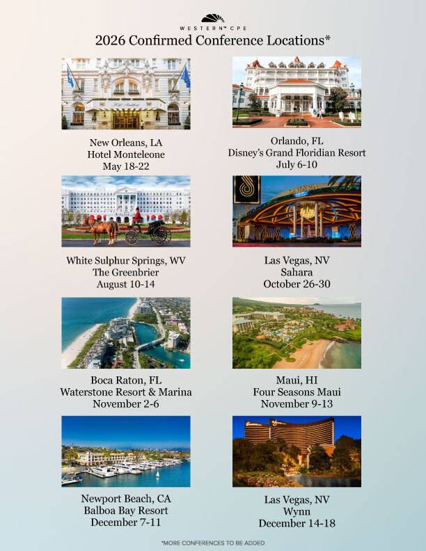 Western CPE has officially announced its 2026 conference locations, bringing together tax, accounting, and finance professionals in some of the most exciting destinations across the United States. These events combine world-class continuing professional education (CPE) with unforgettable travel experiences, making it easy to meet your CPE requirements while networking with industry experts and peers.